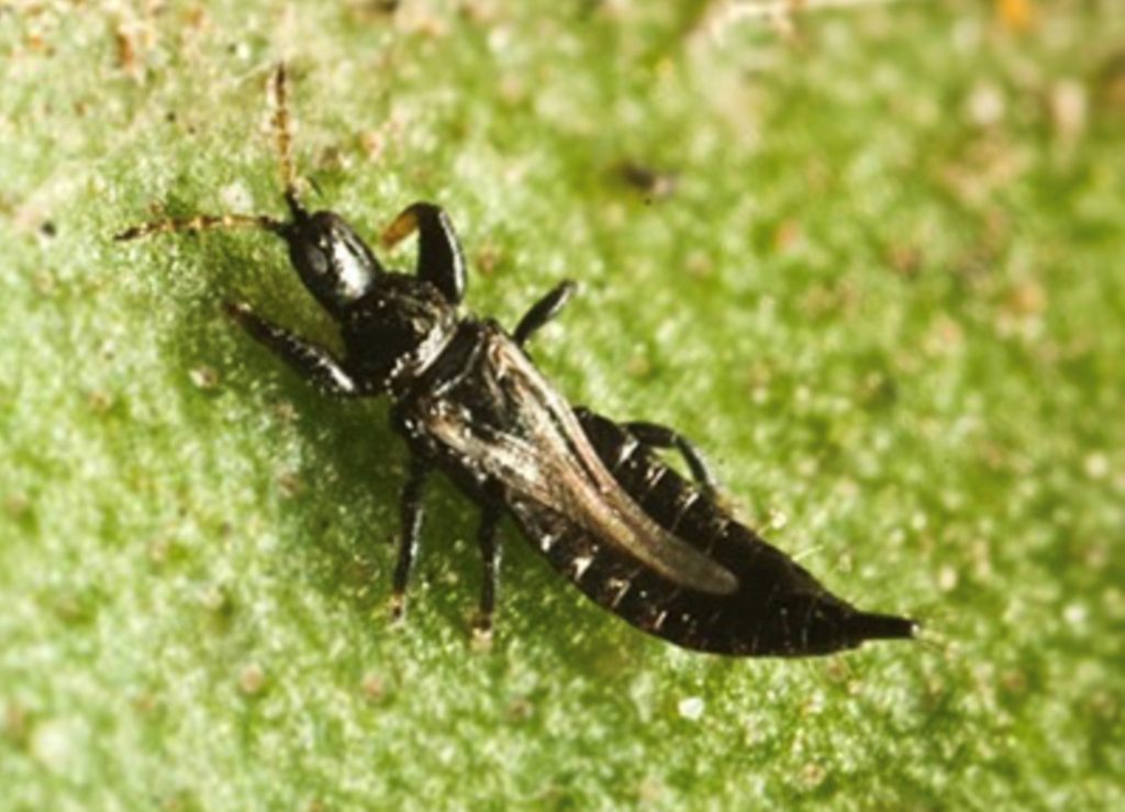 Adult naio thrips are small, dark brown to black and have feathery wings, while their larvae are yellow to orange.