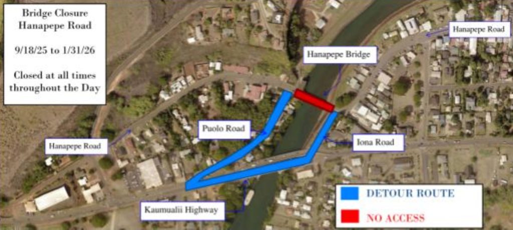 Kaua‘i County Public Works and contractor Kiewit West Infrastructure Co. recently announced that the closure of Hanapēpē Bridge on Hanapēpē Road is extended through early 2026.