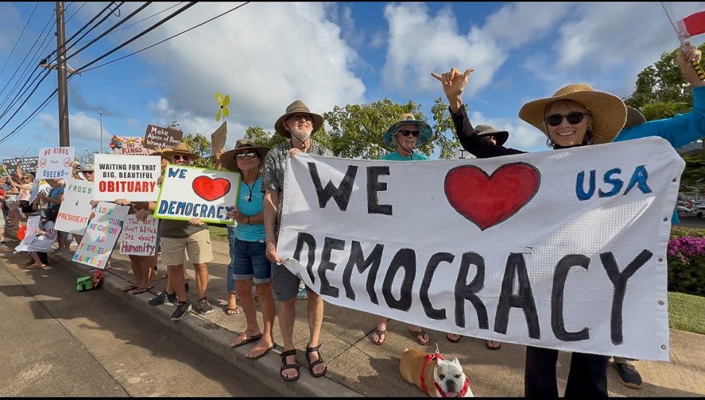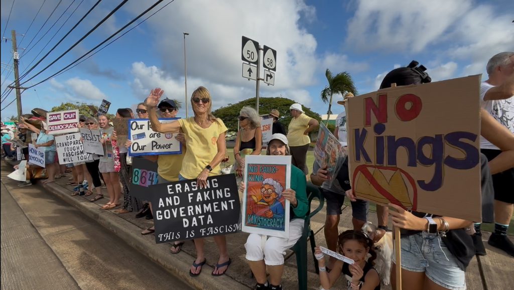 About 500 people lined both sides of Kaumualiʻi Highway in Līhuʻe on Saturday in one of the many “No Kings” demonstrations held across the country to protest President Trump and his Administration.