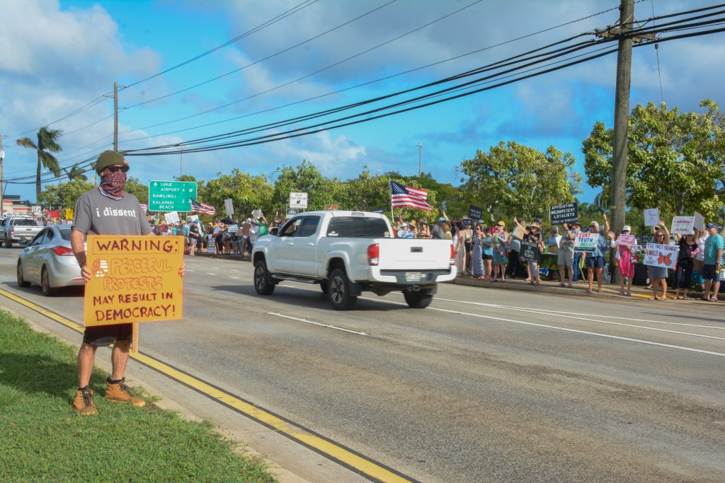 In Līhuʻe, people waved American flags and homemade signs, including one that read: “Make America Humane Again.”