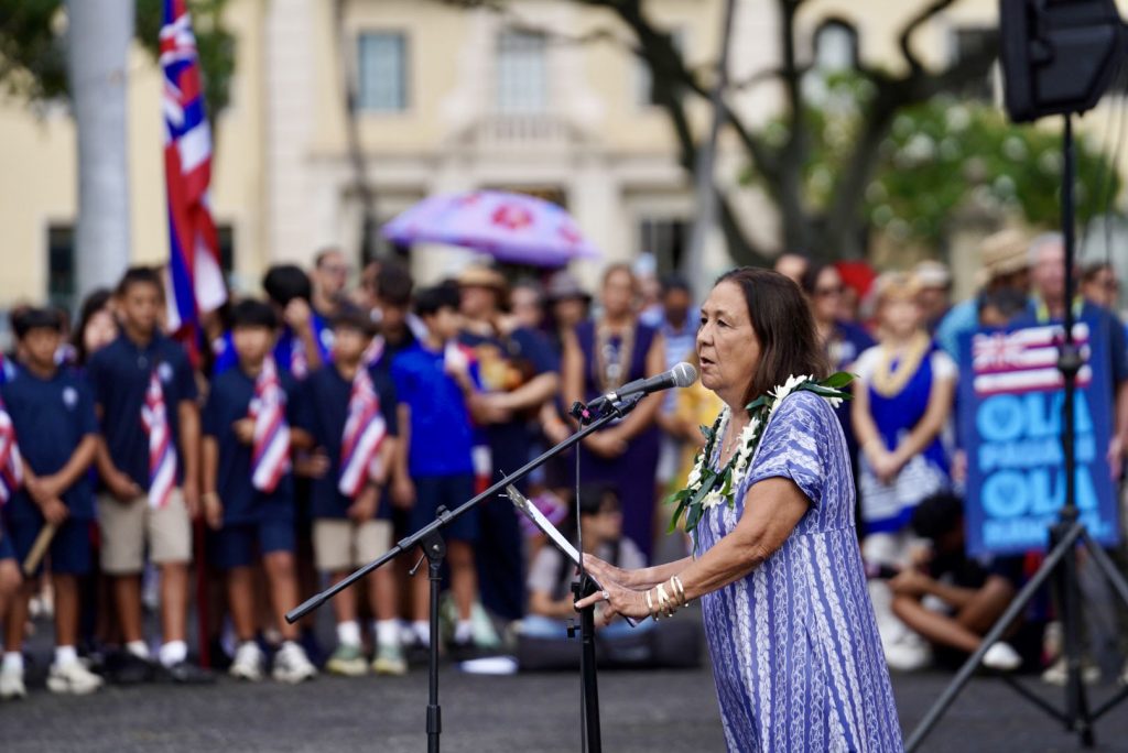 Crystal Kauilani Rose spoke during the gathering in front of ʻIolani Palace in Honolulu on Tuesday, Oct. 21. (Courtesy of Kamehameha Schools)
