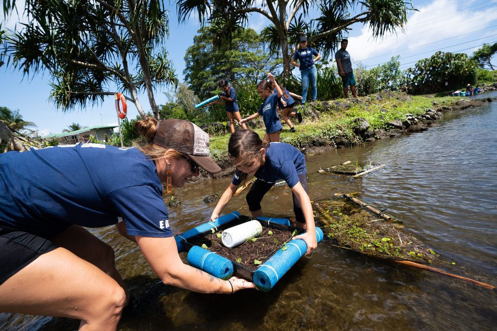 A teacher and student work on a project in wetlands. (Courtesy of Kamehameha Schools I Mua photo shoot for ʻŌiwi Edge)