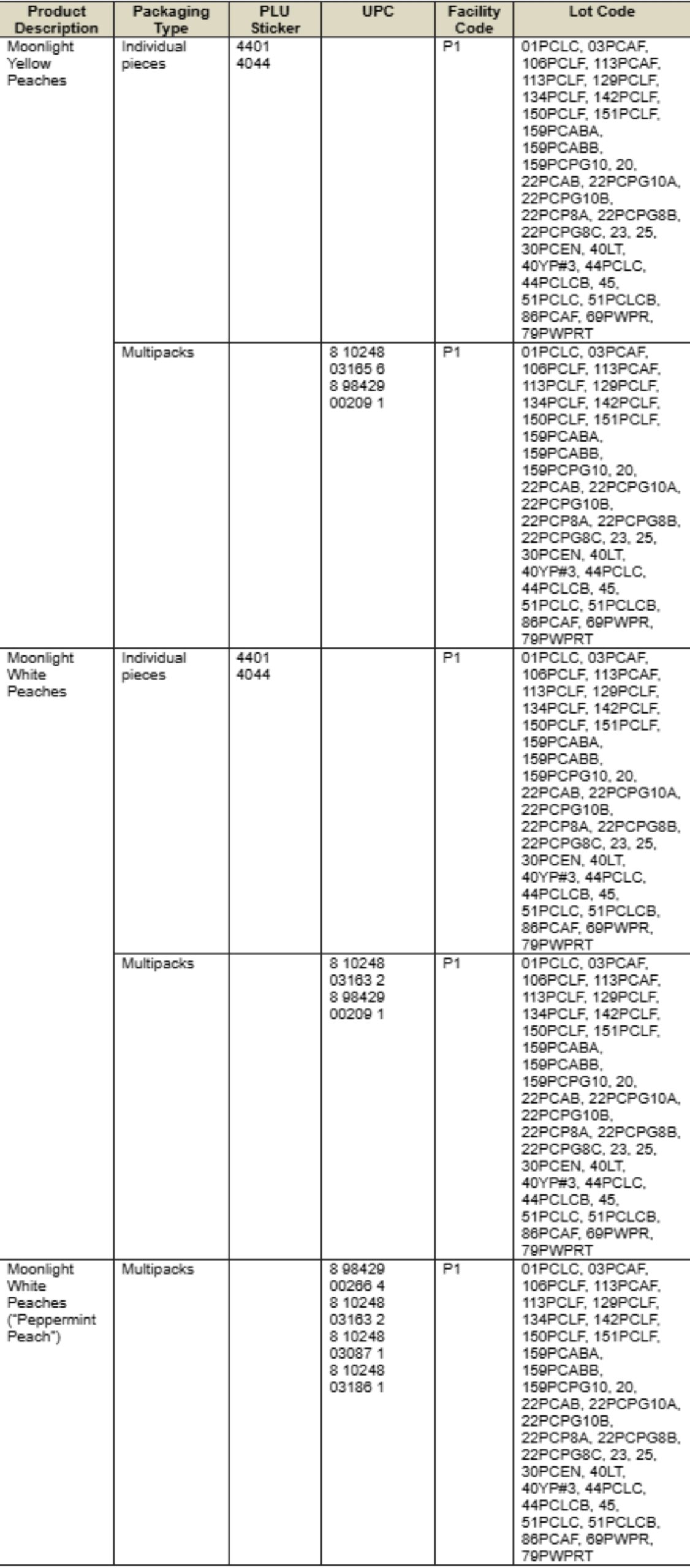 The peaches in question were either sold as individual pieces bearing PLU stickers or as multipacks. This recall does not include packages or PLU stickers with the words “Washington” and/or “Organic.”