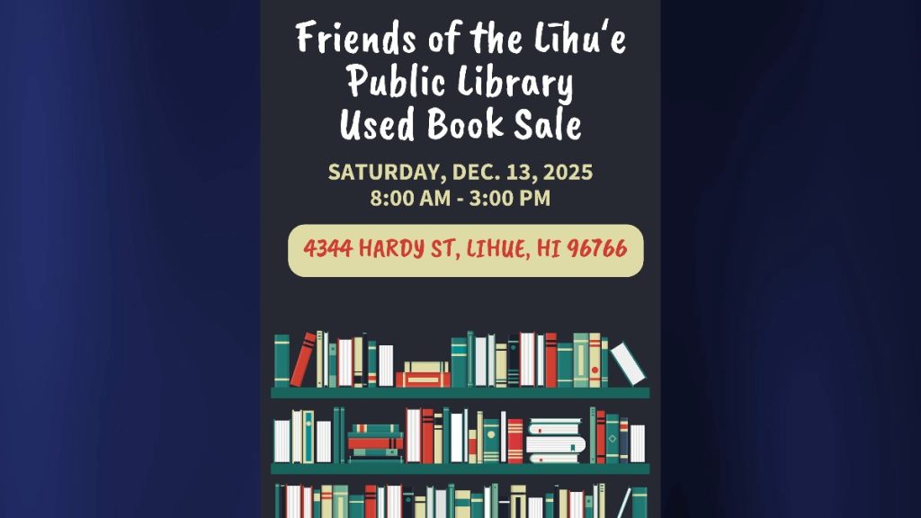 The following weekend, the Friends of Līhuʻe Public Library will hold their biannual used book sale on Saturday, Dec. 13, from 8 a.m. to 3 p.m. in the Līhuʻe Library conference room.