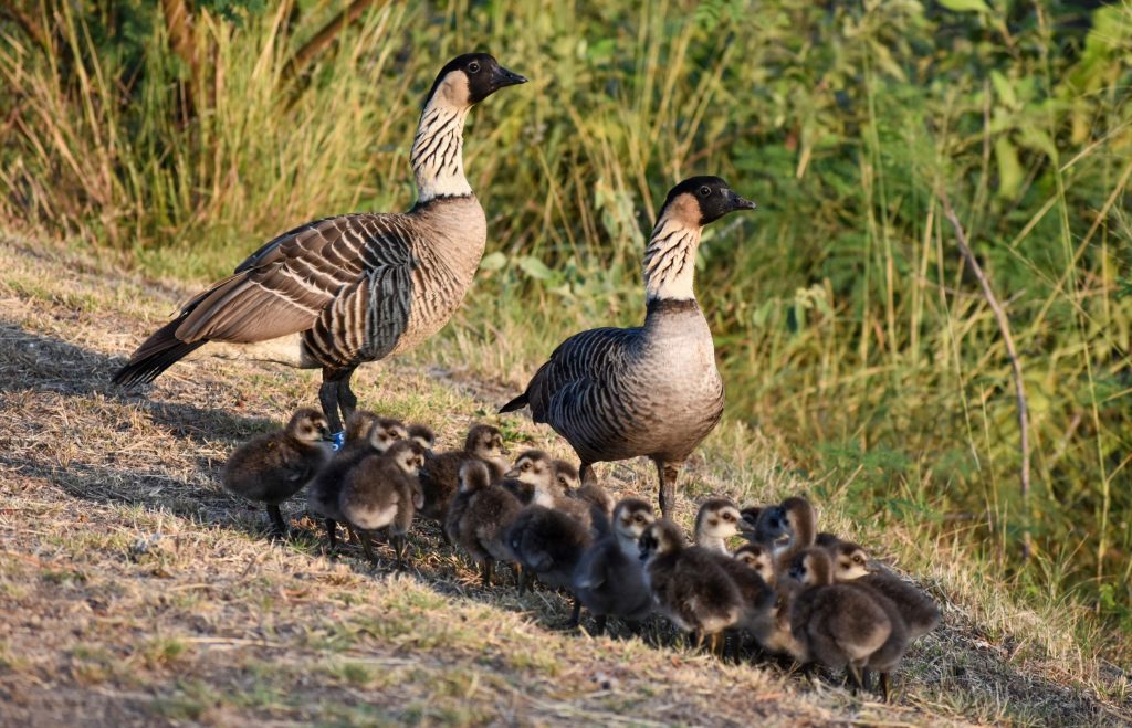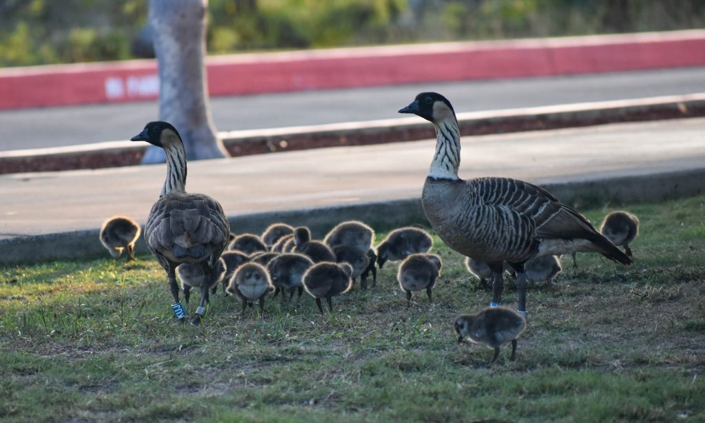 Adult nēnē lead their goslings away from nesting areas from September to April, often crossing roads or moving through high traffic areas and into new feeding grounds.