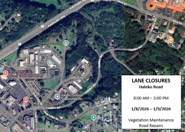 There will be lane closures on portions of Haleko Road from Rice Street to Nāwiliwili Road for vegetation maintenance and road repair work.