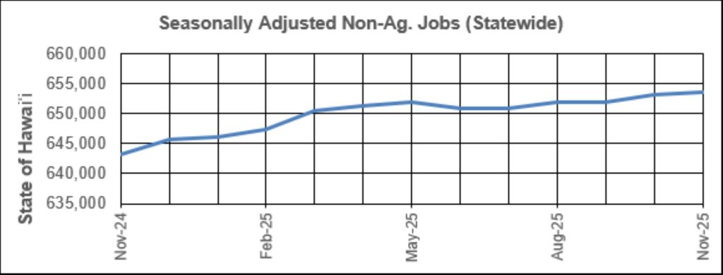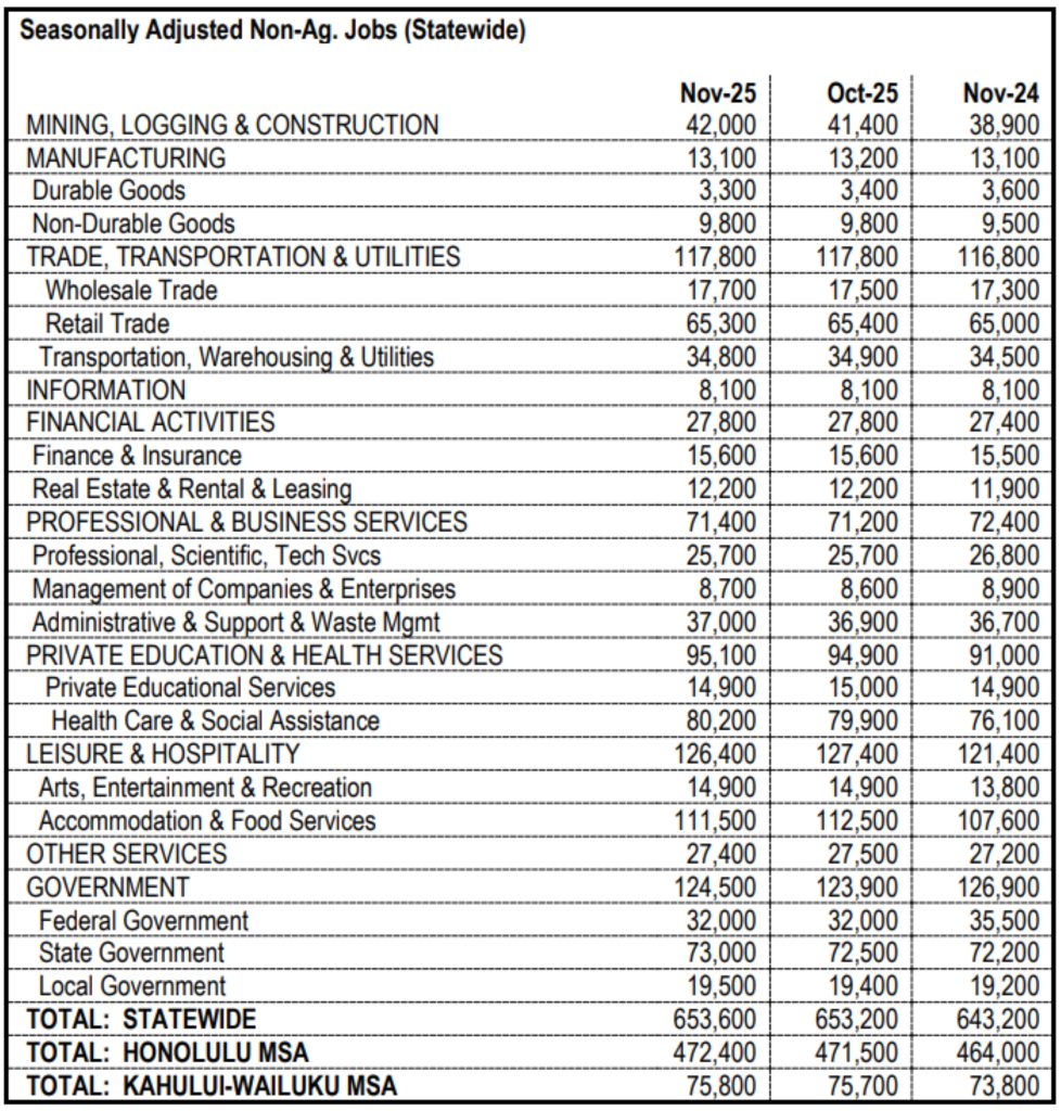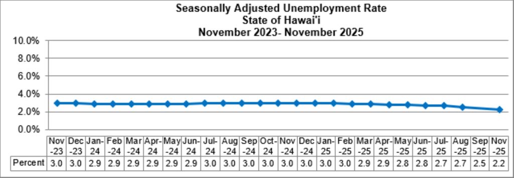 Hawai‘i Department of Business, Economic Development and Tourism reports that the seasonally adjusted unemployment rate for November was 2.2% compared with 2.5% in September.