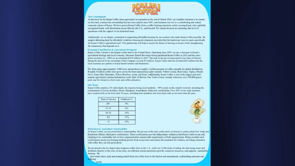 Kauaʻi Coffee Co., one of the island’s largest agricultural employers and a major visitor attraction, addressed the Kauaʻi County Council as its land lease approaches expiration in March.