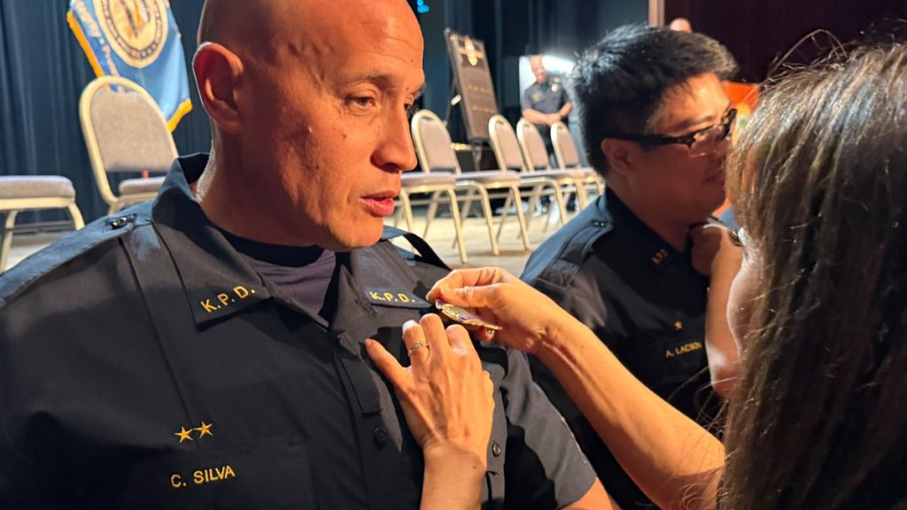 Sgt. Clayton Silva Jr. had his badge pinned on by his wife, Marci, during his promotion to sergeant during the Kaua‘i Police Department Promotional Ceremony on Jan. 8, 2026, . (Photo Credit: Xiomara Yamileth/ Kaua’i Now)