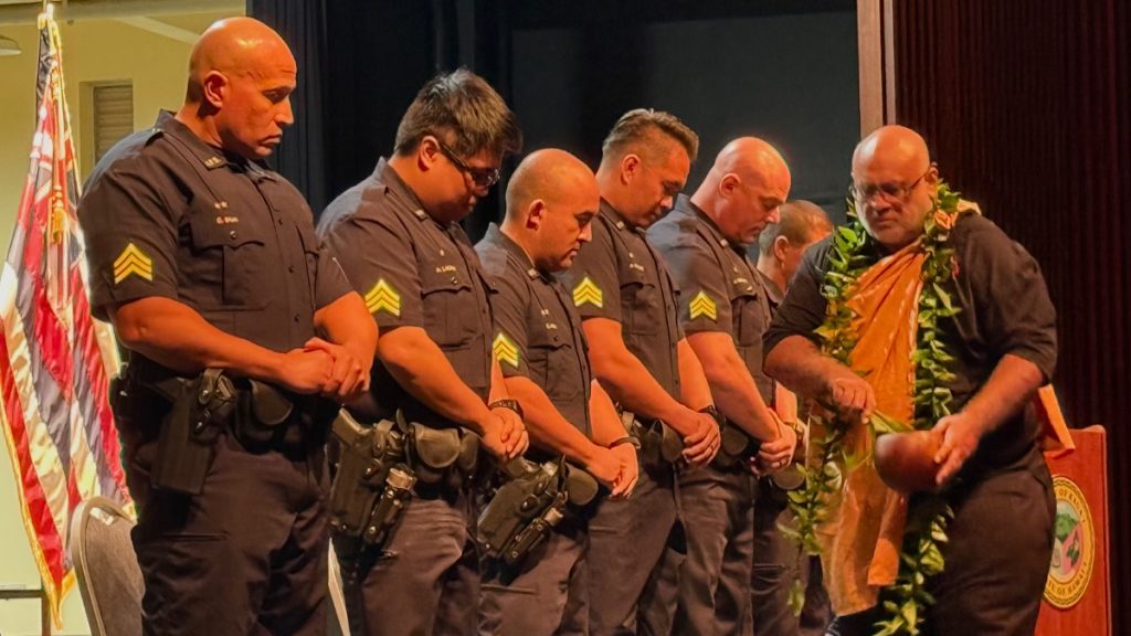 During a Kauaʻi Police Department ceremony on Jan. 8, 2026, eight newly promoted officers stood together on stage, bowing their heads as they received a blessing. (Photo Credit: Xiomara Yamileth/ Kaua’i Now)