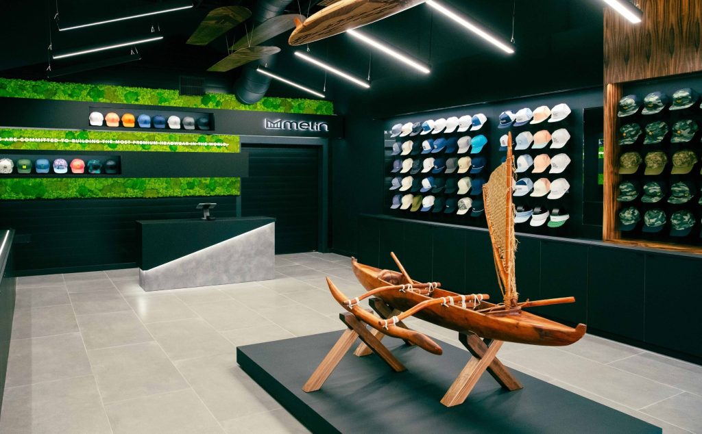 Designed as a gallery-style space, the store showcases melin hats as functional works of art while incorporating meaningful cultural elements, including handcrafted alaia boards displayed throughout the store and a traditional one-man canoe at the center of the space.