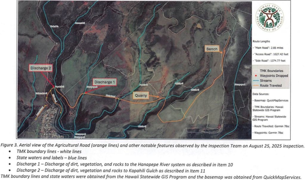 The state issued a notice of violation and order to the construction company because of soil and vegetation discharges into two gulches in Hanapēpē and conducting earth-disturbing activities without a required National Pollutant Discharge Elimination System permit.