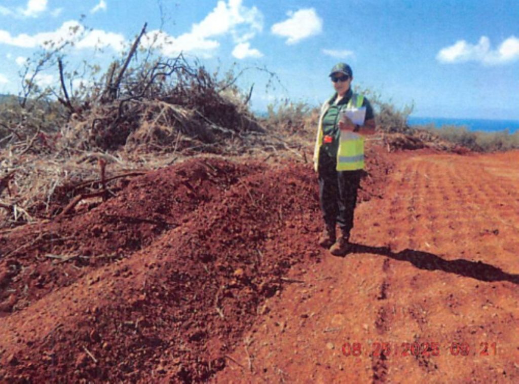 Dirt and vegetation pushed to the east are piled up on the edge of a valley leading down to Hanapēpē River in this photo captured Aug. 25, 2025. (Photo by Jamie Tanimoto/Courtesy of Hawai‘i Department of Health Clean Water Branch/Notice of violation and order issued to Hawaiian Dredging Construction Company)