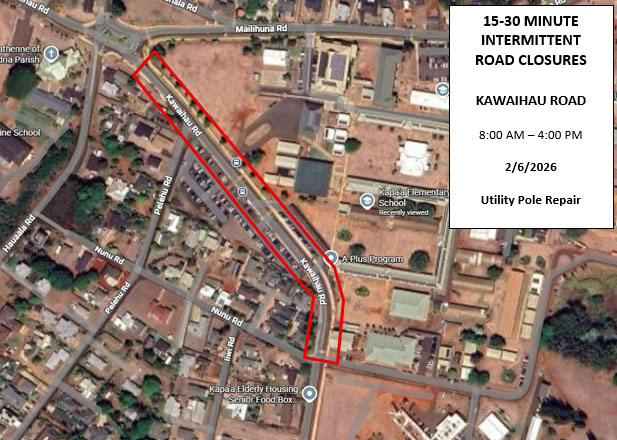 Emergency lane closures and intermittent road closures are scheduled near Kapaʻa Elementary School from 8 a.m. to noon tomorrow, Feb. 6.