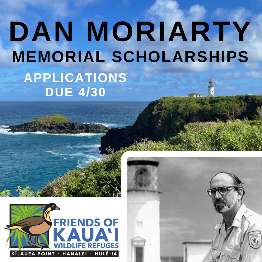 For more information about the Daniel Moriarty Memorial Scholarship or to apply, visit the Friends of Kauaʻi Wildlife Refuges website, or email scholarship@kilaueapoint.org.