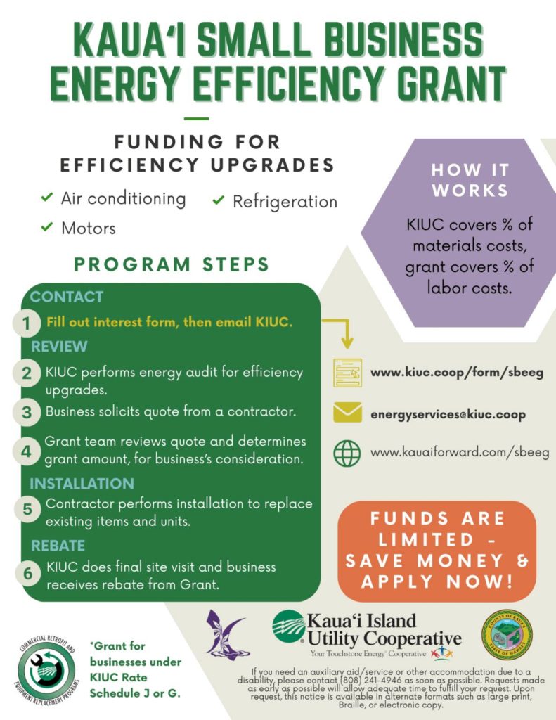 Good news: Kauaʻi Island Utility Cooperative announces that the Kauaʻi Small Business Energy Efficiency Grant program will continue through 2026.