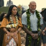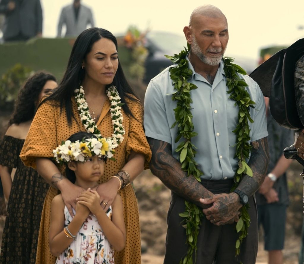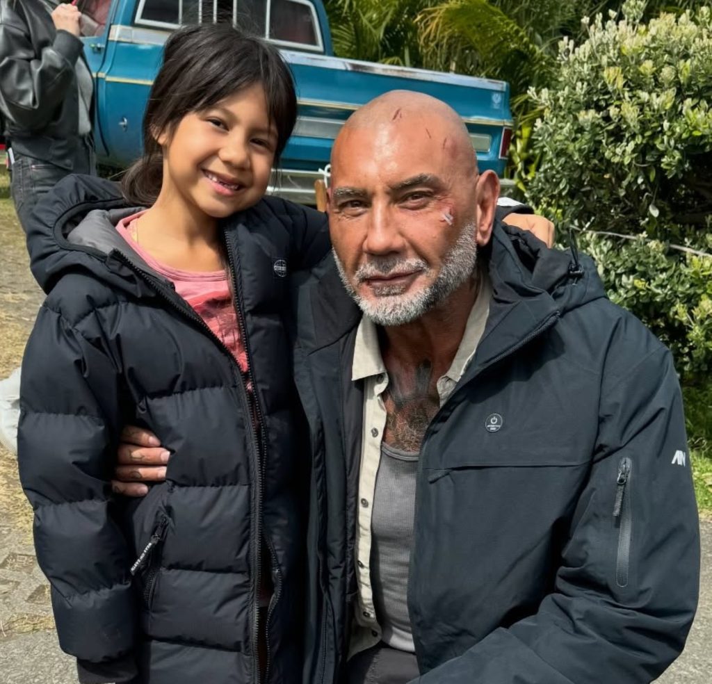 • Maia Kealoha from the Big Island poses with Dave Bautista on the set of “The Wrecking Crew.” (Photo Courtesy: Reel News Hawai‘i)
