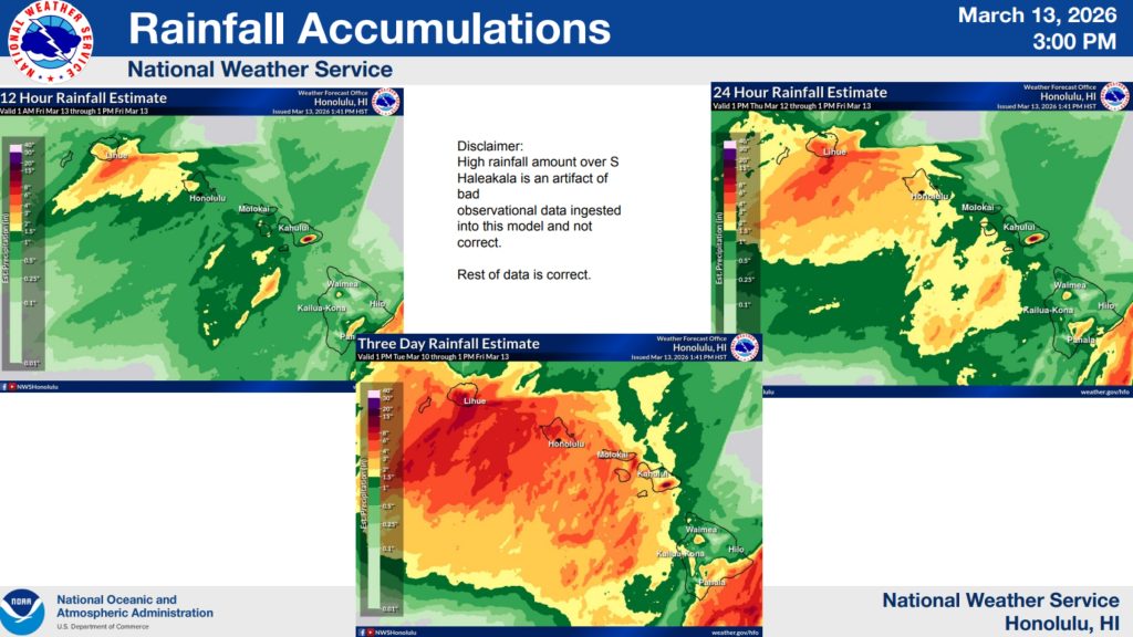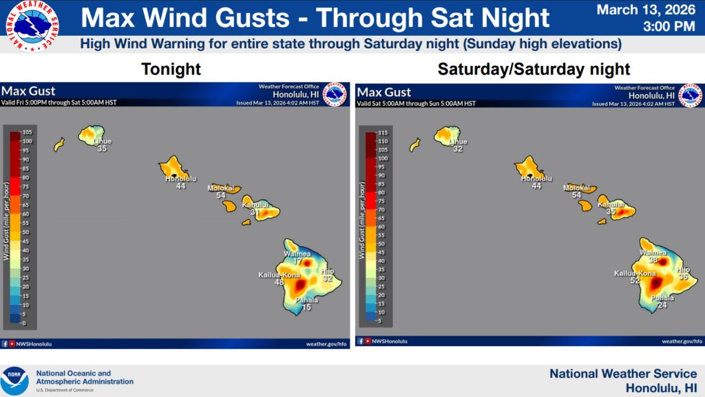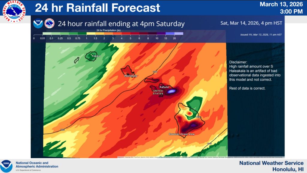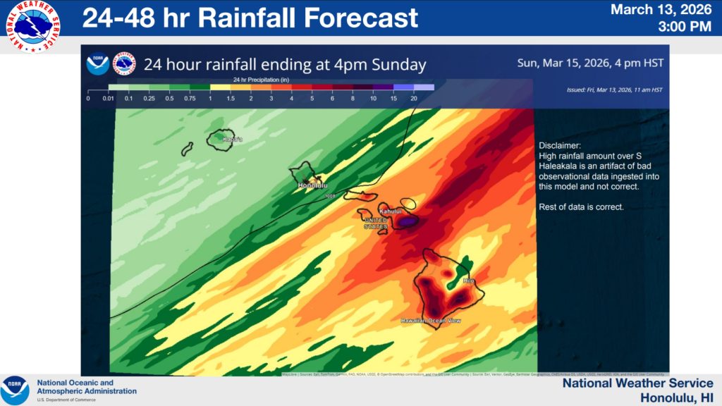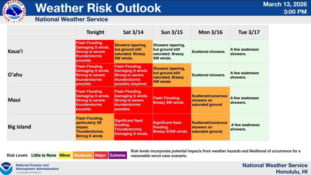 Flood watch: In effect through Saturday afternoon (March 14). Considerable flooding remains possible as a large and powerful kona low continues to draw deep tropical moisture northward across the islands.