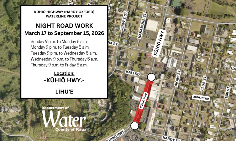 For more information, contact Noah Carter at Alpha Inc. at 808-866-6042, or Scott Suga at the Department of Water at 808-245-5411, or email publicrelations@kauaiwater.org.