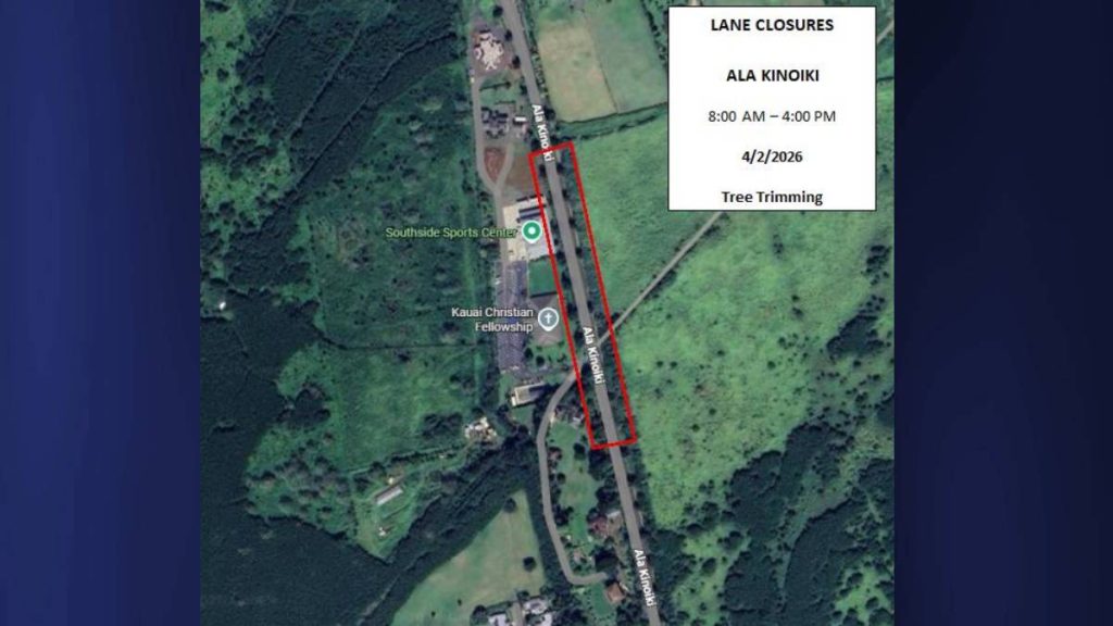 Single-lane closures along a portion of Ala Kinoiki in the vicinity of Kaua‘i Christian Fellowship in Po‘ipū are scheduled for Thursday, April 2, for tree-trimming work along the roadway.
