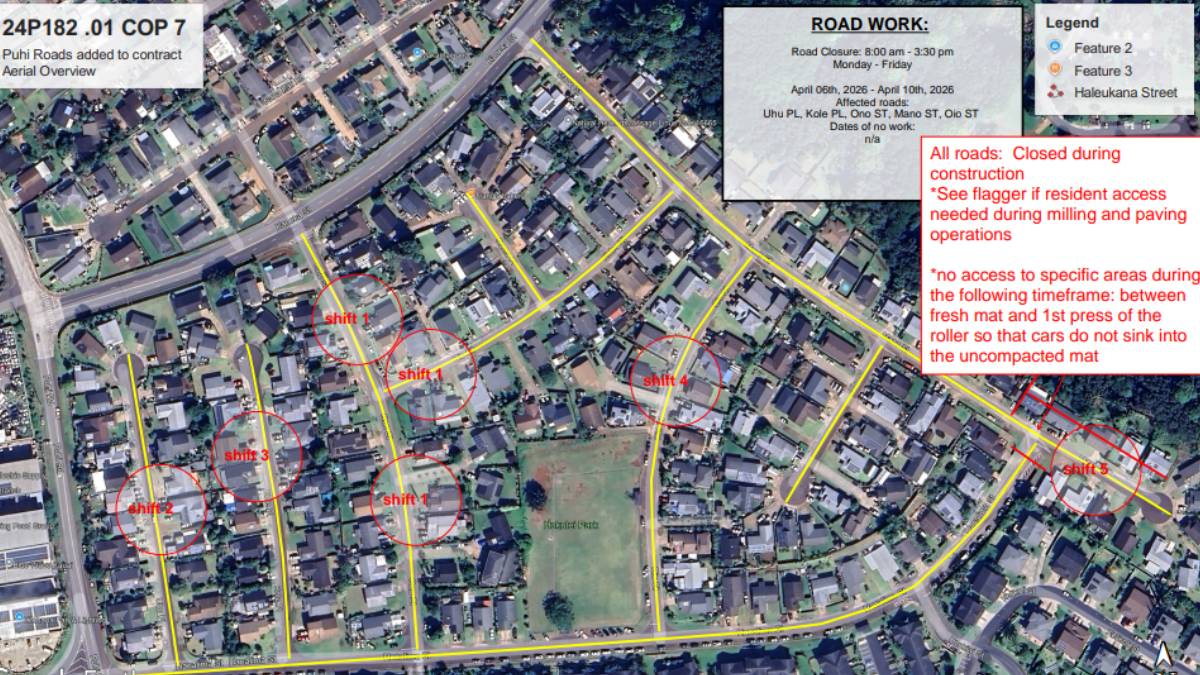The Department of Public Works and its contractor, Grace Pacific LLC, will be working along Hanalima Street, ʻŪhū Place, Kolē Place, ʻŌno Street, Kākū Street, Māno Street, ʻŌʻio Street, and ʻĒhū Place from 8 a.m. to 3:30 p.m. Monday, April 6, to Friday, April 10, weather permitting.