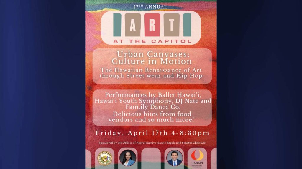 Hosted by Big Island state Rep. Jeanné Kapela and Oʻahu state Sen. Chris Lee, this event is a collaboration between the Hawaiʻi Legislature and Hawaiʻi State Foundation on Culture and the Arts “Arts in Public Places” program.