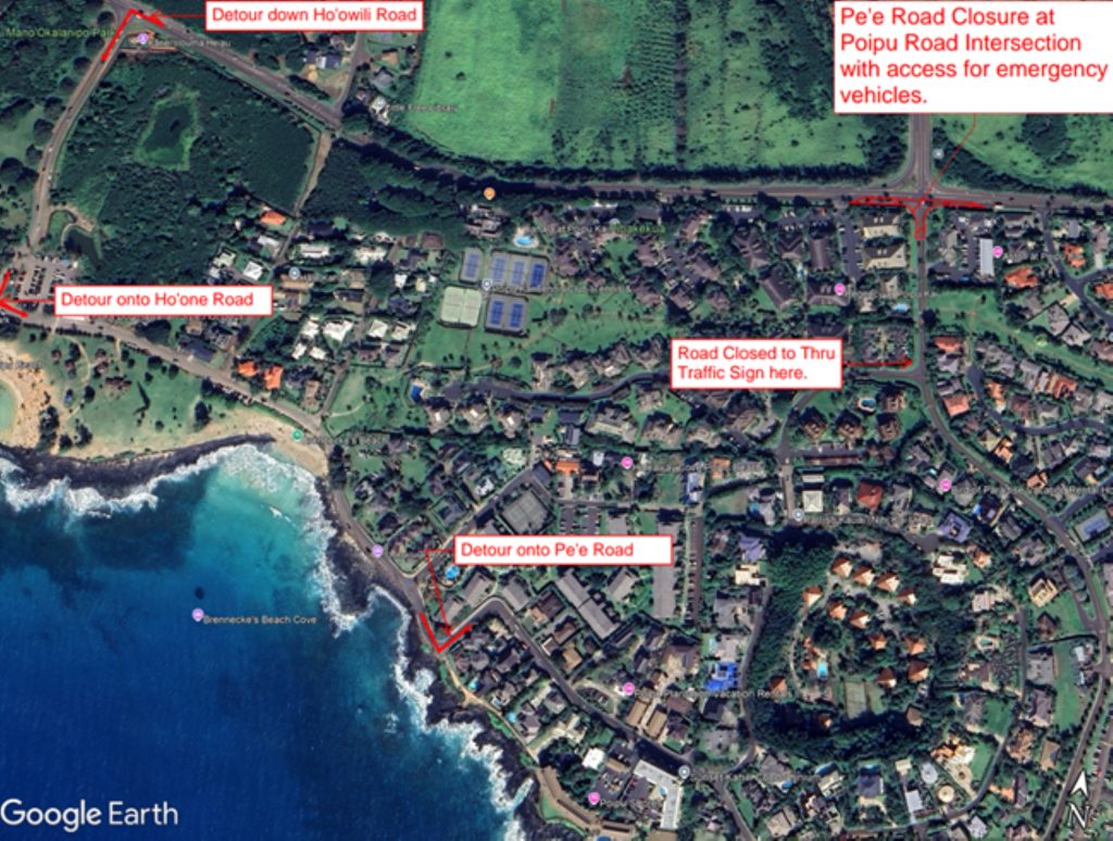 A detour is in place from down Ho‘owili to Ho‘one Road and then connecting to Pe‘e Road. This will allow access to the south side of Pe‘e Road.