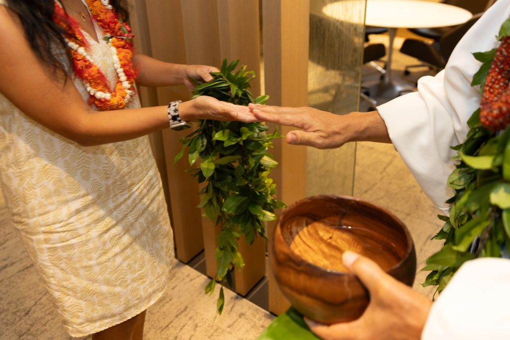 Kahu Kordell Kekoa offers Agatha Viernes-LeGros fresh rainwater as part of a blessing ceremony for the new Center for Family Business and Entrepreneurs at Bank of Hawai‘i. (Courtesy Photo: Bank of Hawaiʻi)