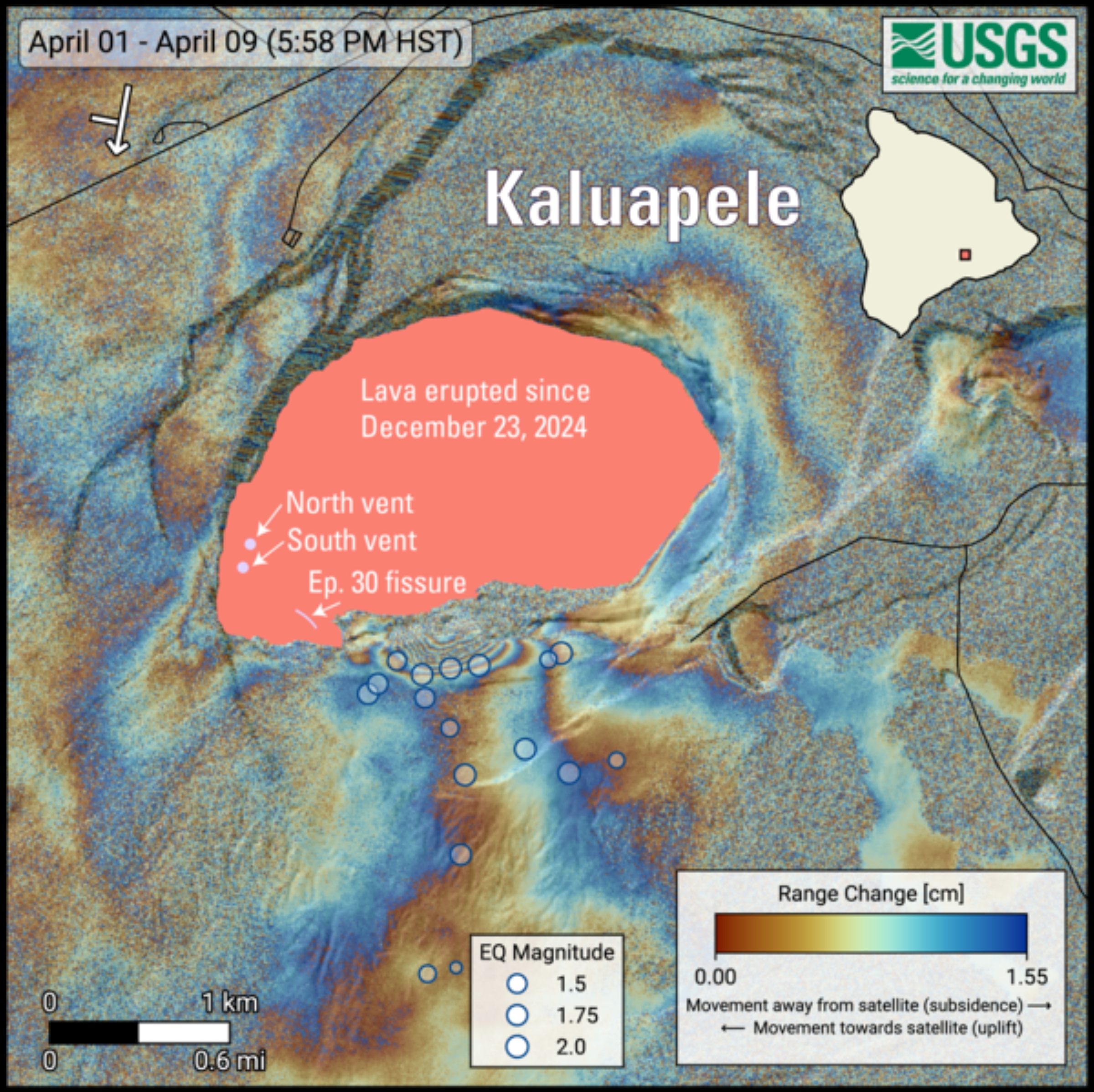 Kīlauea has erupted episodically within the summit caldera since Dec. 23, 2024. Episode 44 of summit lava fountaining happened for 8.5 hours April 9. No unusual activity has been noted along Kīlauea’s East Rift Zone or Southwest Rift Zone.