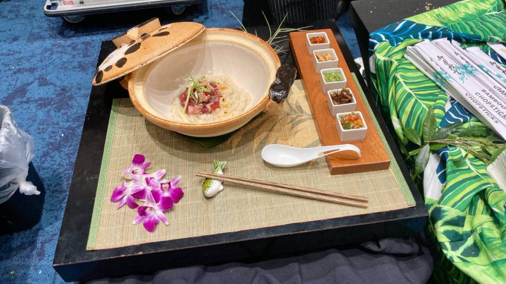 “Maybe he did make a bowl of congee and put some fresh ‘ahi on it, too,” Gusman said as he bustled around his table early Saturday evening, unaware he would end the night as the event’s winner. As such, his name will be engraved on the Kaua‘i Poke Fest’s crystal poke bowl.