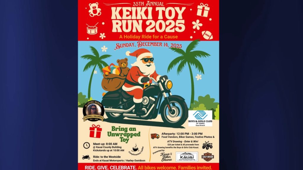 Kauaʻi Motorsports and the islandʻs Harley-Davidson dealership will host their 35th annual Keiki Christmas Toy Run on Sunday, bringing back one of the Garden Isle’s longest-running holiday traditions of supporting local children in need.
