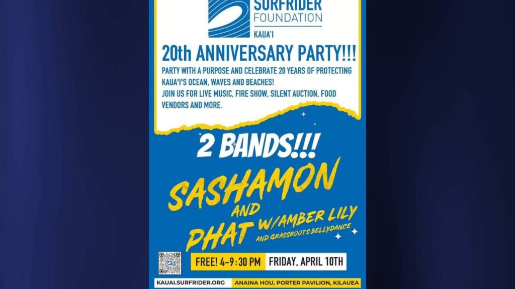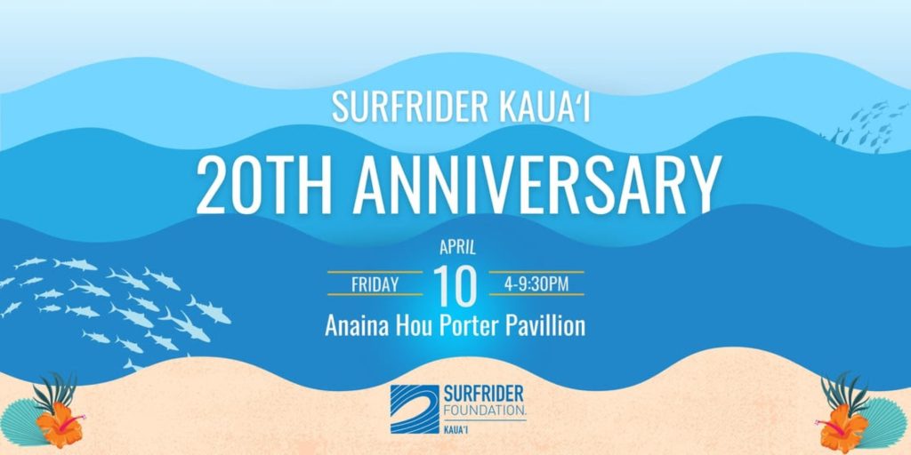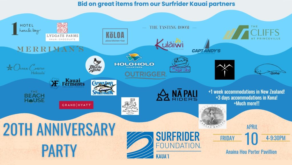 Come party with a purpose from 4 to 9 p.m. Friday, April 10, and celebrate two decades of the nonprofit environmental organization protecting Kauaʻi’s ocean, waves and beaches.