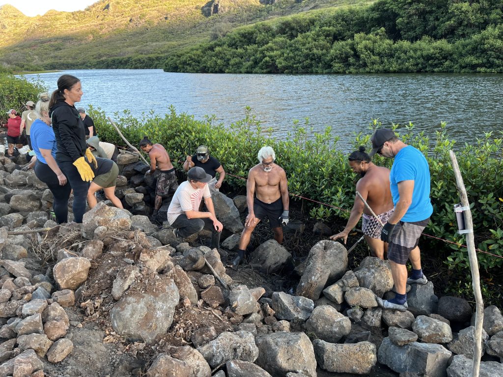 This upcoming workday is part of the nonprofit’s continuing multi-year effort to restore the Hulēʻia watershed and stabilize the fishpond’s kuapā (rock wall).