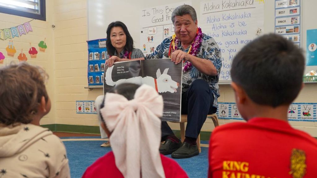 Five of the island’s nine public elementary schools now offer pre-kindergarten education opportunities; Hawai’i Lt. Gov. Sylvia Luke and Hawai’i Senate President Ronald Kouchi, who represents Kauaʻi and Niʻihau, paid a recent visit to the new King Kaumualiʻi Elementary classroom.