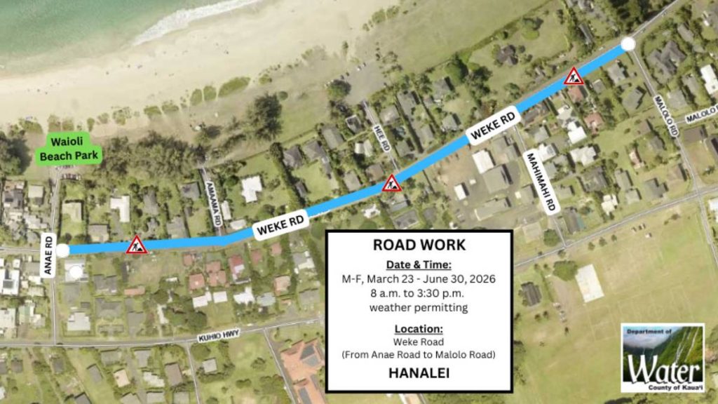 The road work will take place on Weke Road from ʻAnae Road to Mālolo Road from 8 a.m. to 3:30 p.m. from Monday, March 23, to Tuesday, June 30.Hawai‘i News County of Kauaʻi urges vigilance as another Kona low may affect the island this…